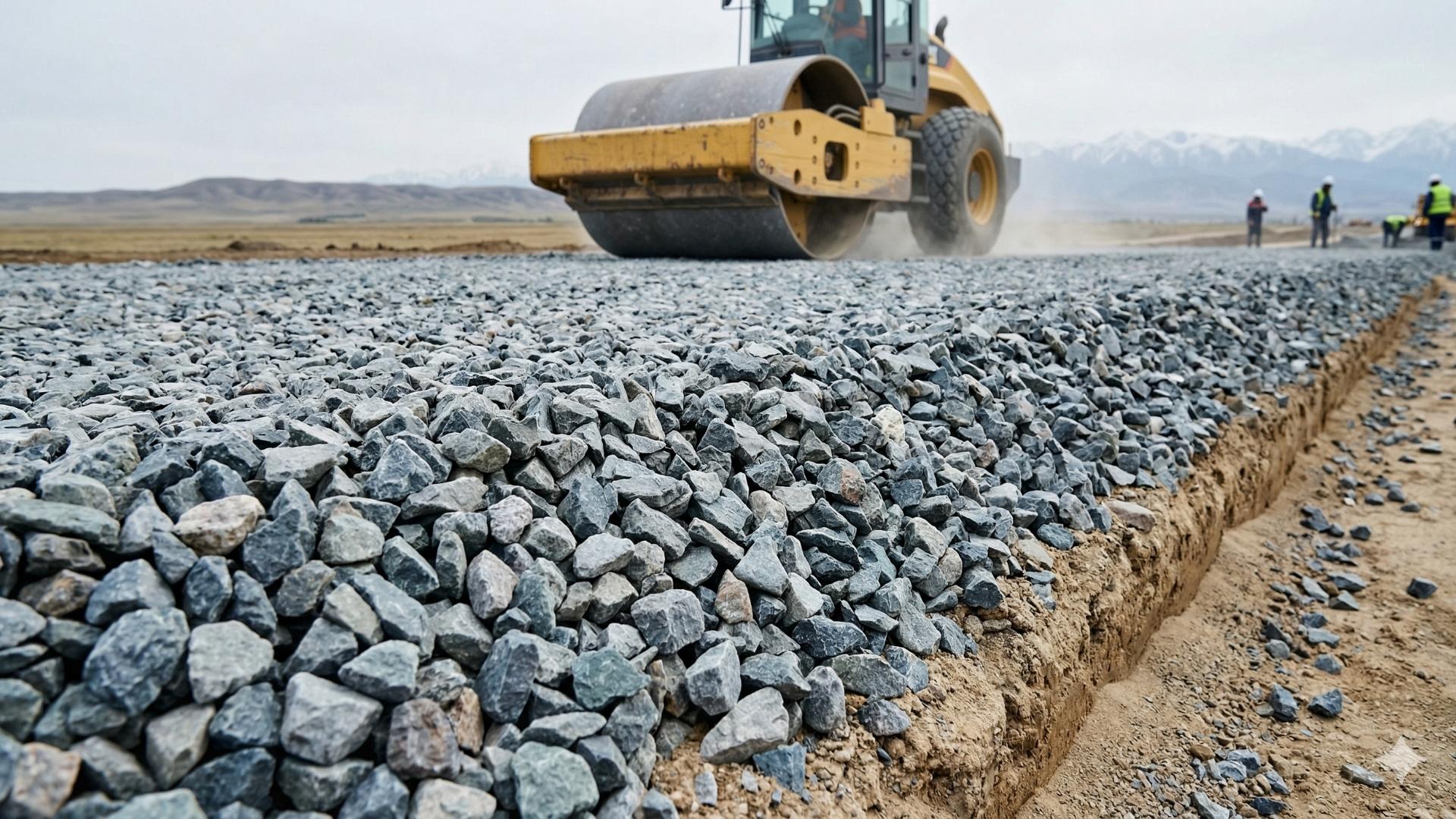 Фракционный щебень 20-40 мм, уплотнение тяжёлым катком.