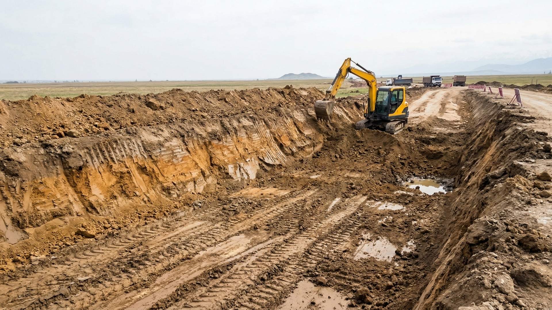 Геодезия, выемка слабого грунта, уплотнение основания виброкатком.