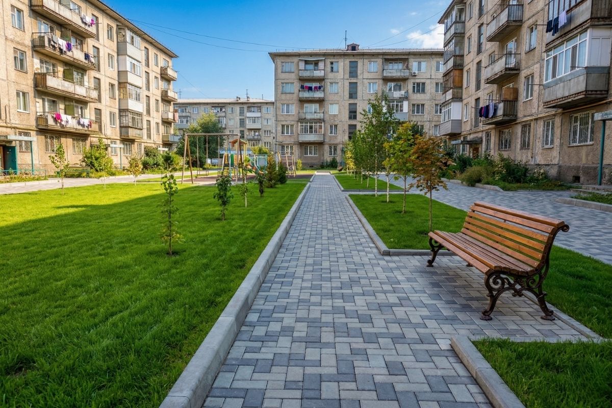 Выложили плиткой весь участок — 120 м². Узор ровный, дренаж работает. Через год ничего не просело.